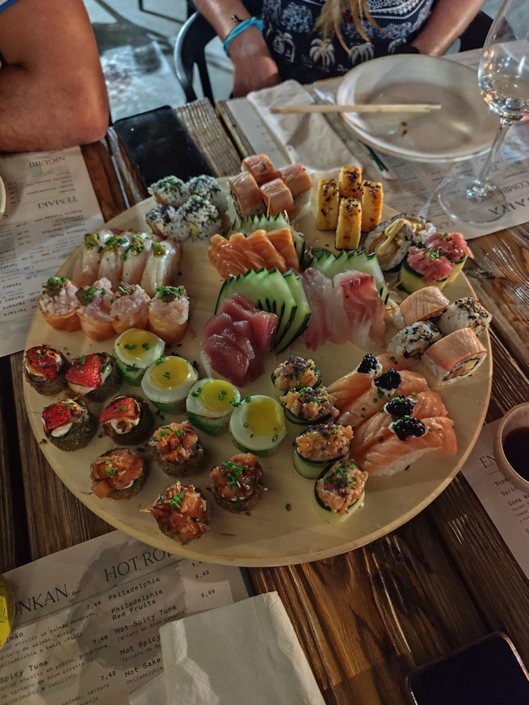 Mas nem tudo é caos! Eu e a amiga que veio comigo de Portugal fomos a um sushi muito bom e super engraçado, onde a comida vinha em corredores giratórios – uma espécie de jogo de apanhar o melhor prato o mais rápido possível.