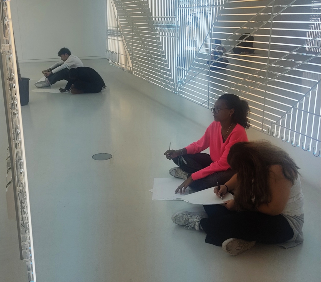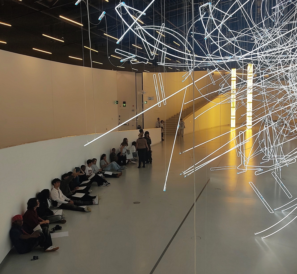 A turma do 1.º ano saiu da sala para uma aula de desenho no MAAT, orientada pela professora Fabrícia Valente. Numa sessão imersiva, os alunos exploraram a exposição “Forms in Space… through Light (in Time)”, de Cerith Wyn Evans, onde puderam observar, desenhar e interpretar as instalações luminosas do artista. Uma experiência que uniu observação, criatividade e o contacto direto com a arte contemporânea.
